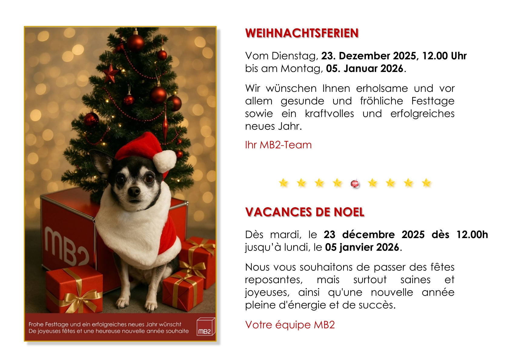 Feiertage – Jours fériés: 23.12.25 – 05.01.26: